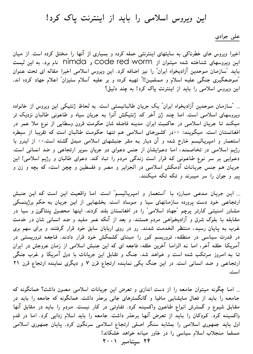 روز ٣ مهر ماه ١٣٨٠ على جوادى عضو حزب کمونيست کارگرى (کميتۀ مرکزى)، سايت